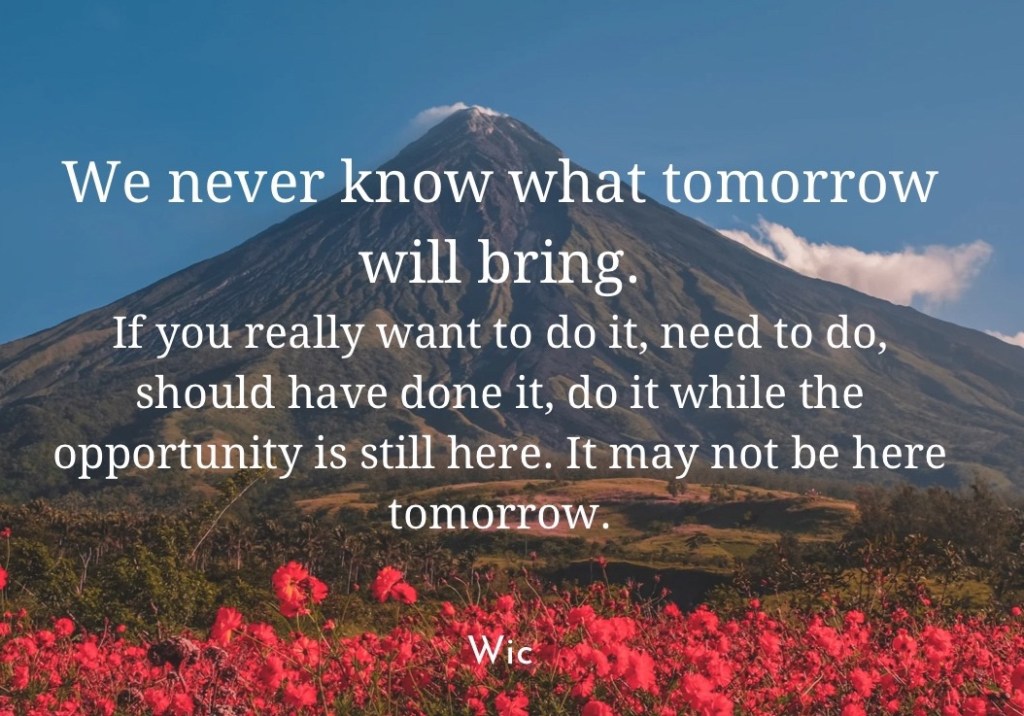 That applies to the experiences you want to gain, yes, but it also applies to the things you think you should, or would like to, say to others. Make your peace while there is time. Say your “thank you’s” and if it hasn’t yet been done, tell that person that you do love them. Tomorrow is actually one day nearer to not being able to do it.